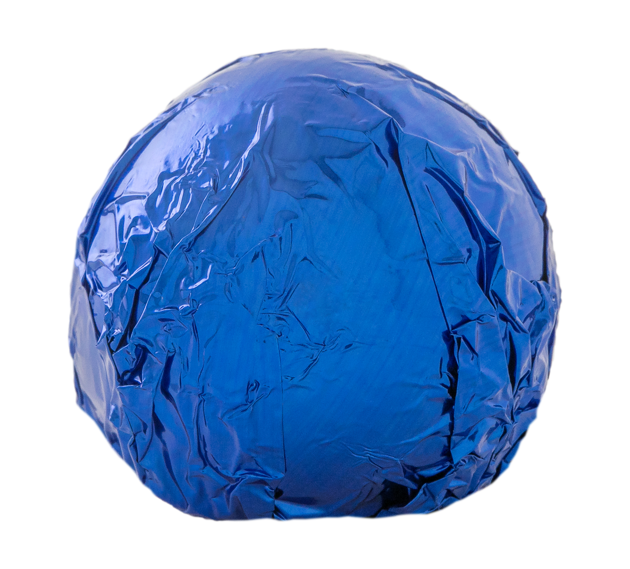 Hazelnut truffle enrobed in milk chocolate and wrapped in blue foil.