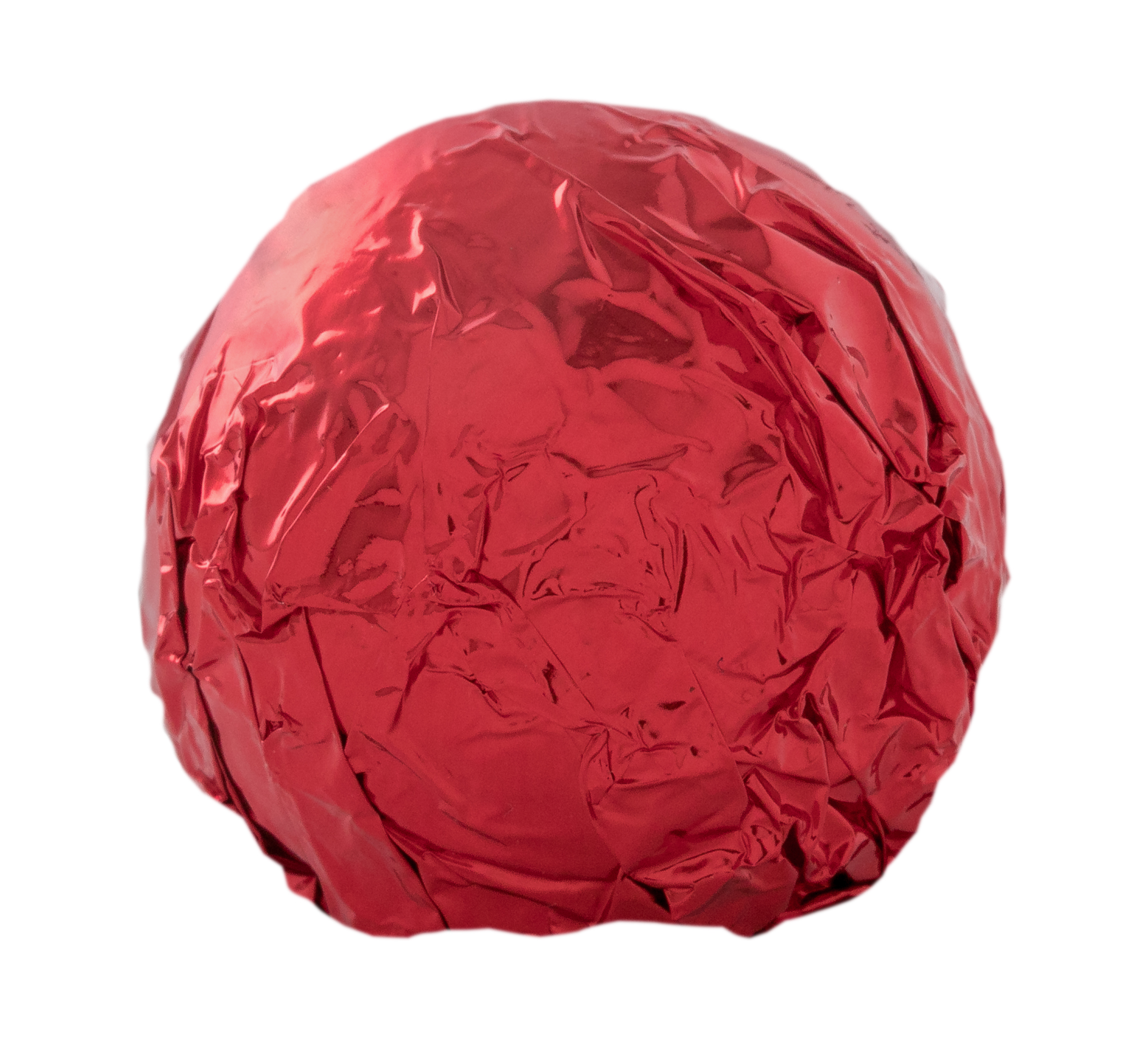 Chocolate truffle enrobed in milk chocolate and wrapped in red foil.