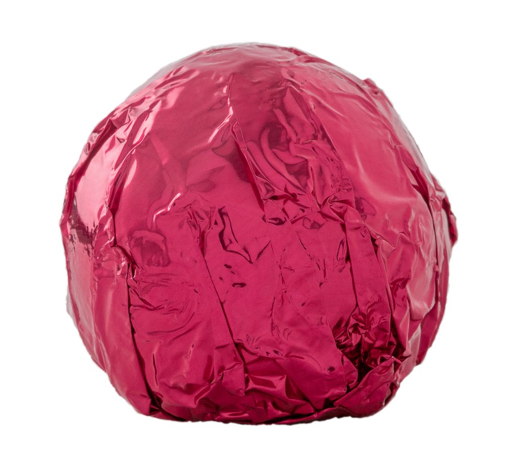Raspberry truffle coated with dark chocolate and wrapped in fuchsia foil.
