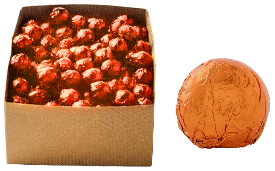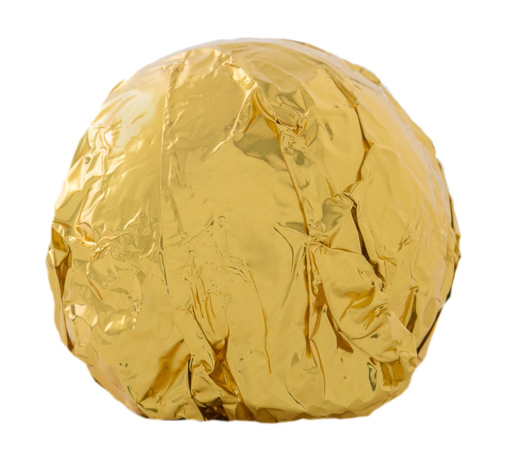 Chocolate truffle enrobed in milk chocolate and wrapped in gold foil.