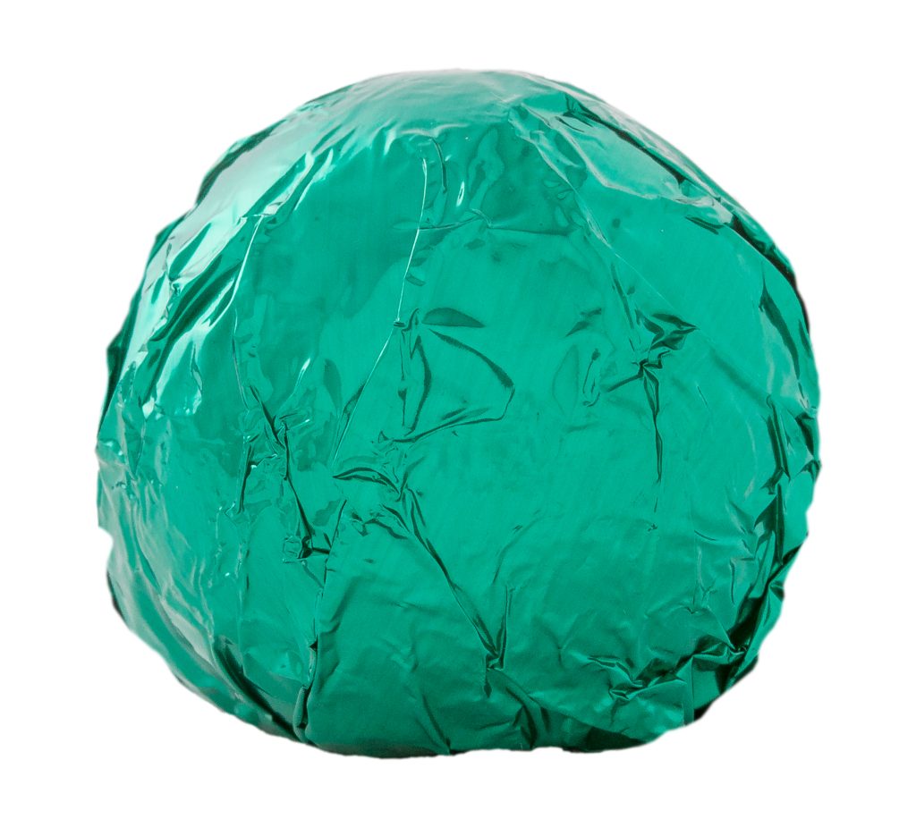 Chocolate truffle enrobed in dark chocolate and wrapped in green foil.
