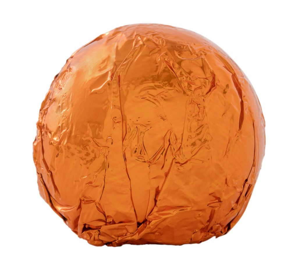 Orange truffle enrobed in dark chocolate and wrapped in orange foil.