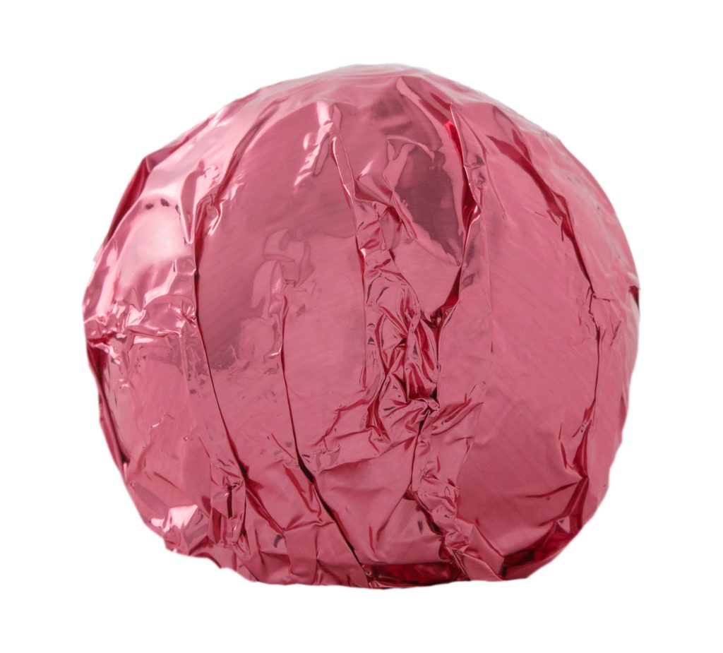 Champagne truffle enrobed in milk chocolate and wrapped in pink foil.