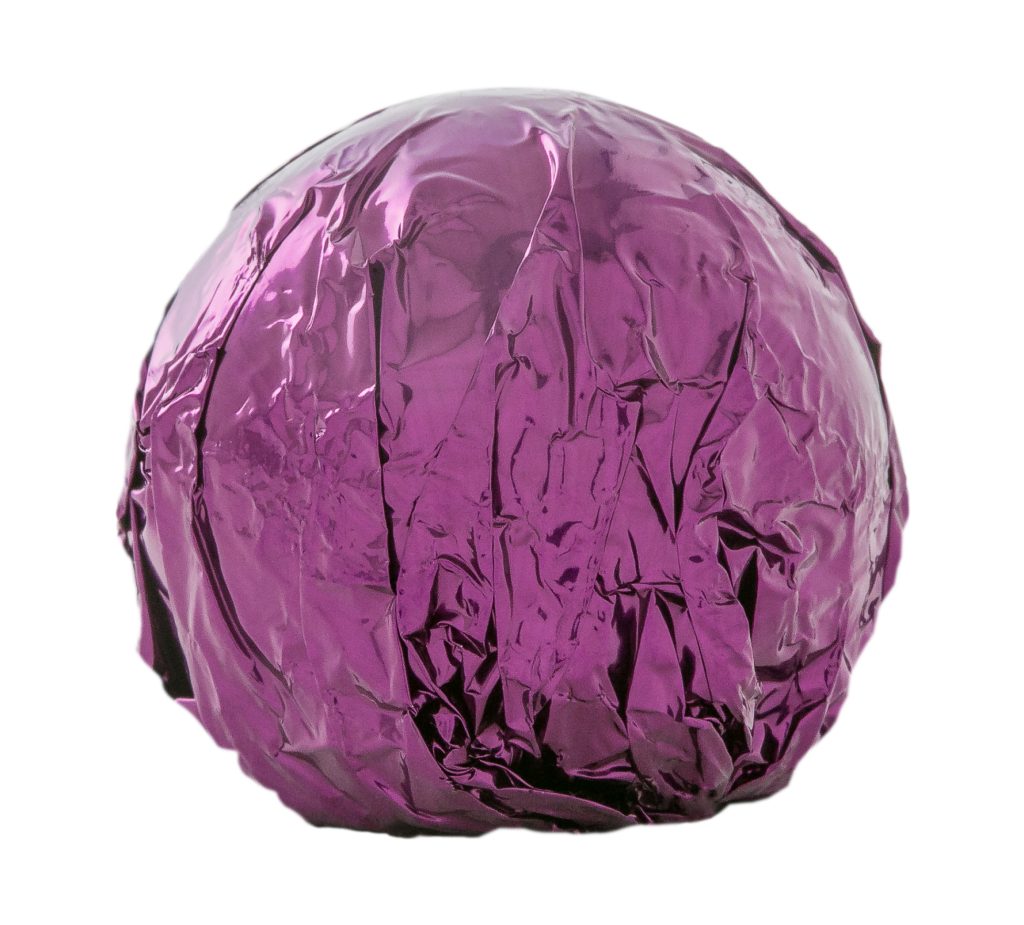 Amaretto truffle enrobed in milk chocolate and wrapped in purple foil.