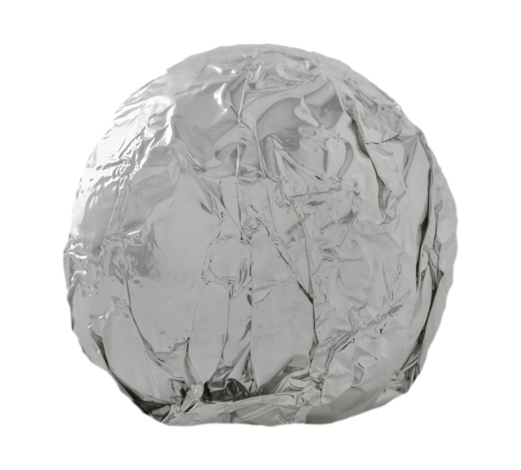 Chocolate truffle enrobed in dark chocolate and wrapped in silver foil.
