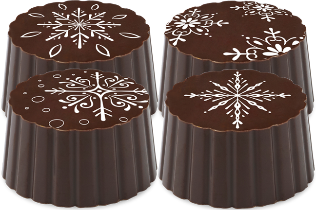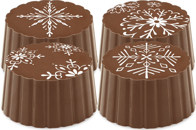 An assortment of seven snowflake designs: A creamy flurry of cocoa magic that dances on your taste buds like a winter wonderland waltz. It’s the warm hug of chocolatey bliss on a frosty day.