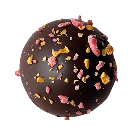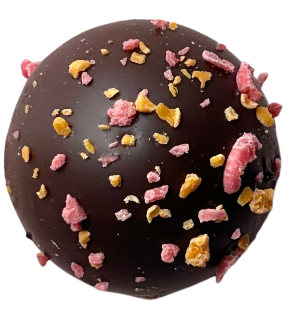 This flavor brings the vibrant energy of summer to life. The delightful blend of peaches and dark chocolate evokes memories of sunny days and carefree moments. Our peach ganache, covered in rich dark chocolate and topped with playful pink and orange sprinkles, celebrates the joy of the season.