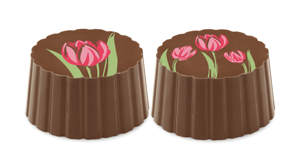 This milk chocolate truffle is decorated with beautiful pink tulips. Brighten up your store or online presence with these spring-blooming delights! If there’s ever been a time to send chocolates & flowers in one, it’s now! Perfect for Mother’s Day as well. *The two designs will come assorted in each layer, exact numbers of each design are not guaranteed.