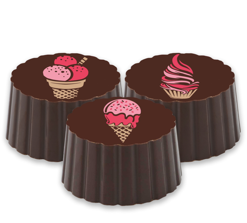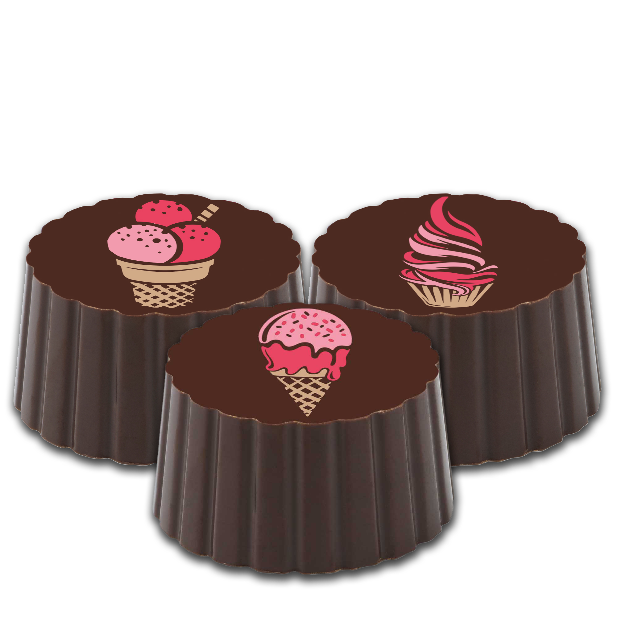 This limited edition offering gives us all the warm weather feels. A classic combination of strawberries and dark chocolate is reminiscent of gathering at the ice cream parlor on a hot summer night. Our pink Strawberry Ice Cream ganache, covered in rich dark chocolate with a vibrant red stripe, commemorates the summer season. All 3 ice cream designs come mixed in one stock box.